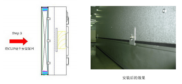 FFU安裝指導指南步驟3:然后將CLIP 勾住高效過濾器的凹槽,并逐一安裝固定,安裝完畢,檢查FFU 箱體與過濾器結合是否均勻,緊密。