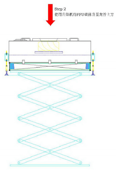 FFU安裝指導指南步驟2:將FFU整體放在升降機上,并調節升降機位置,使升降機上FFU整體處于FFU龍骨中心位置;使用升降機慢慢將FFU整體升至FFU龍骨正上方。