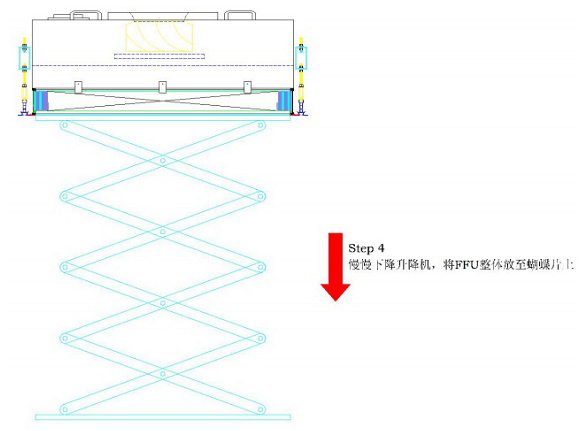 FFU安裝指導指南步驟5:移走升降機,完成FFU箱體及高效過濾器的安裝,如下圖所示: