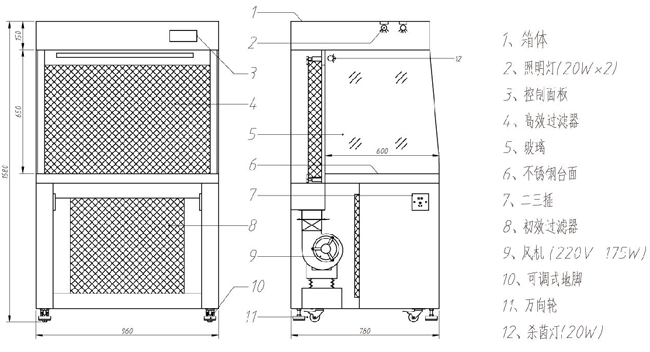水平流超凈工作臺方案圖標示了各大組成部分的配件名稱,目的是為了讓用戶更清楚的了解水平流超凈工作臺構造。